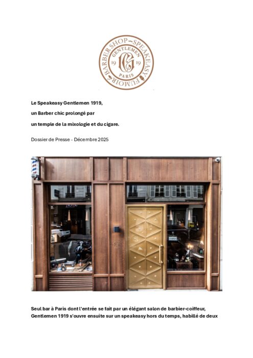 Seul bar à Paris dont l'entrée se fait par un élégant salon de barbier-coiffeur, Gentlemen 1919 s'ouvre ensuite sur un speakeasy hors du temps, habillé de deux fumoirs, réservant une des plus belles caves à cigares de France. Gentlemen 1919 est aujourd'hui le premier et unique Habanos Lounge de France et s'habille de deux PINs au fameux Pinncle guide.