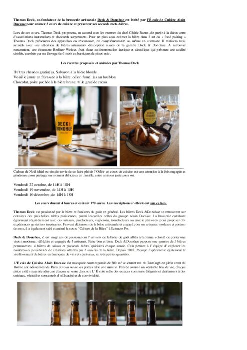 Métiers 10 septembre 2021 - 12:57 Thomas Deck, co-fondateur de la brasserie artisanale Deck & Donohue est invité par l'École de Cuisine Alain Ducasse pour animer 3 cours de cuisine et présenter ses accords mets-bières. PDF (151 Ko) Télécharger