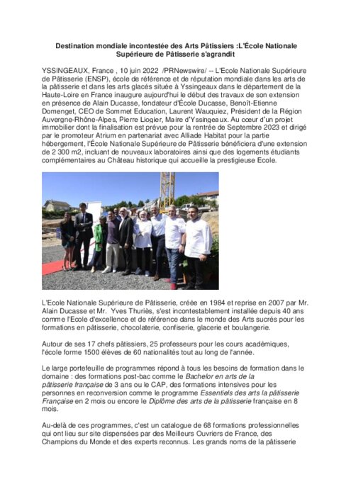 L'Ecole Nationale Supérieure de Pâtisserie (ENSP), école de référence et de réputation mondiale dans les arts de la pâtisserie et dans les arts glacés située à Yssingeaux dans le département de la Haute-Loire en France inaugure aujourd'hui le début des travaux de son extension en présence de Alain Ducasse, fondateur d'École Ducasse, Benoît-Etienne Domenget, CEO de Sommet Education, Laurent Wauquiez, Président de la Région Auvergne-Rhône-Alpes, Pierre Liogier, Maire d'Yssingeaux.