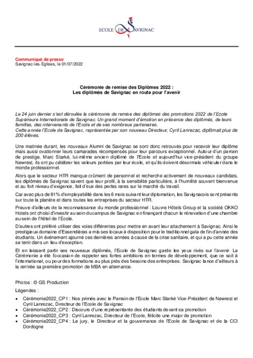 Le 24 juin dernier s’est déroulée la cérémonie de remise des diplômes des promotions 2022 de l’Ecole Supérieure Internationale de Savignac. Un grand moment d’émotion en présence des diplômés, de leurs familles, des intervenants de l’Ecole et de ses nombreux partenaires.