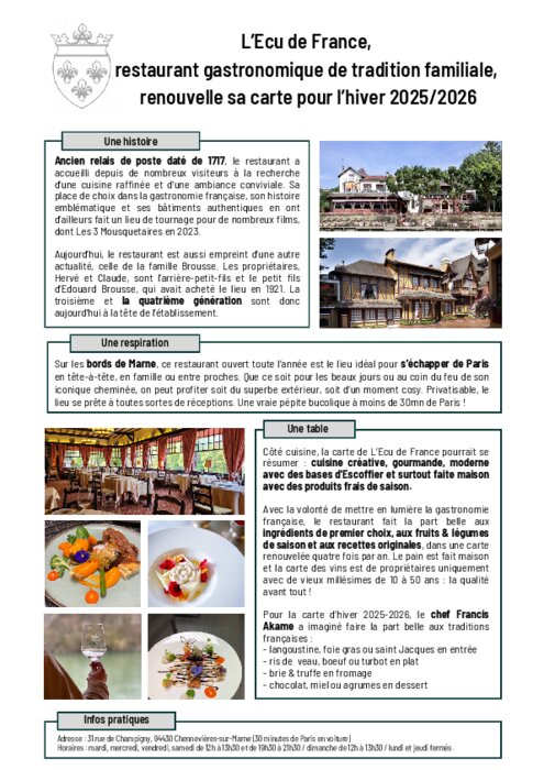 Ancien relais de poste daté de 1717, L'Écu de France propose une expérience culinaire hors du temps à 30mn de Paris. Depuis 1920, la famille Brousse propose une cuisine raffinée et d’une ambiance conviviale. Sa place de choix dans la gastronomie française, son histoire emblématique et ses bâtiments authentiques en ont d’ailleurs fait un lieu de tournage pour de nombreux films, dont Les 3 Mousquetaires en 2023.