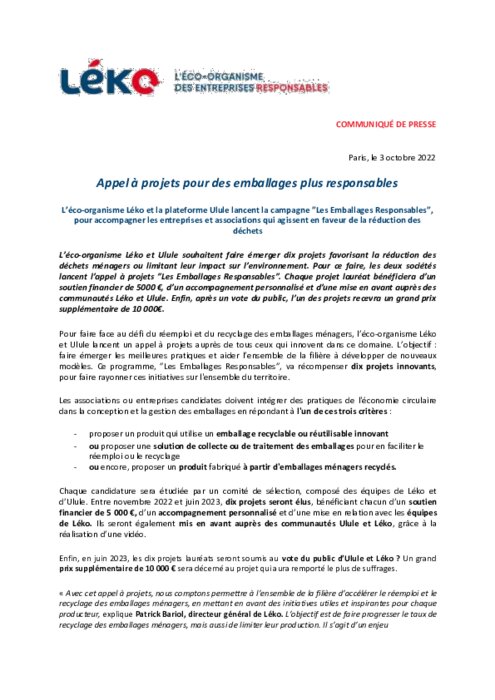 Pour faire face au défi du réemploi et du recyclage des emballages ménagers, l’éco-organisme Léko et la plateforme Ulule lancent la campagne ”Les Emballages Responsables", pour accompagner les entreprises et associations qui agissent en faveur de la réduction des déchets.