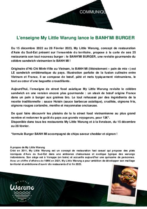 Du 15 décembre 2022 au 28 Février 2023, My Little Warung, concept de restauration d'Asie du Sud-Est présent sur l’ensemble du territoire, propose à la carte de ses 25 restaurants son tout nouveau burger : le BANH'MI BURGER, une revisite gourmande du célèbre sandwich vietnamien le BANHMI.