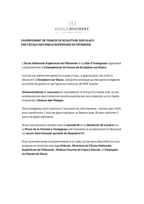 Métiers 13 octobre 2025 - 15:17 Lors de cet événement gratuit et ouvert à tous, le grand public est invité à découvrir la Sculpture sur Glace, discipline artistique qui fait partie intégrante du métier de glacier et qui figure au concours de MOF Glacier. PDF (56 Ko) Télécharger