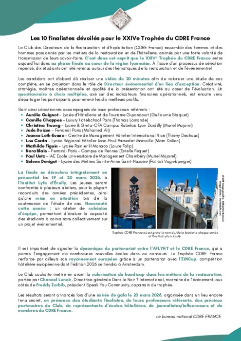 Le Club des Directeurs de la Restauration et d'Exploitation (CDRE France) rassemble des femmes et des hommes passionnés par les métiers de la restauration et de l’hôtellerie, animés par une forte volonté de transmission de leurs savoir-faire. C’est dans cet esprit que le XXIVᵉ Trophée du CDRE France entre aujourd’hui dans sa phase finale au cœur de la région lyonnaise. À l’issue d’un processus de sélection repensé, dix étudiants ont été retenus autour des thématiques de la restauration et de l’événementiel.