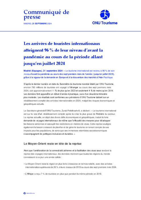 Métiers 19 septembre 2024 - 13:57 Le tourisme international est revenu à 96 % de son niveau d’avant la pandémie au cours des sept premiers mois de l’année (jusqu’en juillet 2024), grâce à la vigueur de la demande en Europe et à la réouverture des marchés d’Asie-Pacifique. PDF (163 Ko) Télécharger