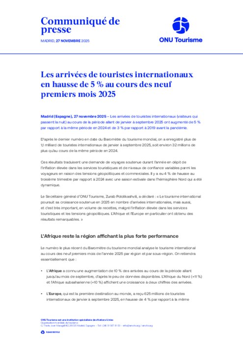 Métiers 03 décembre 2025 - 12:30 Les arrivées de touristes internationaux (visiteurs qui passent la nuit) au cours de la période allant de janvier à septembre 2025 ont augmenté de 5 % par rapport à la même période en 2024 et de 3 % par rapport à 2019 avant la pandémie. PDF (49 Ko) Télécharger