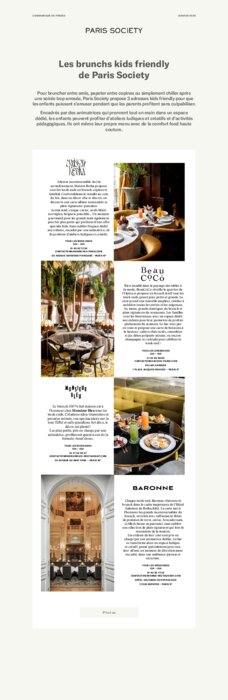 Restauration commerciale 28 janvier 2026 - 08:29 Pour bruncher entre amis, papoter entre copines ou simplement chiller après une soirée trop arrosée, Paris Society propose 3 adresses kids friendly pour que les enfants puissent s’amuser pendant que les parents profitent sans culpabiliser. PDF (409 Ko) Télécharger