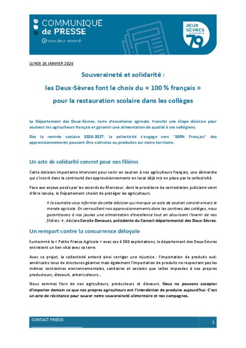 Le Département des Deux-Sèvres, terre d’excellence agricole, franchit une étape décisive pour soutenir les agriculteurs français et garantir une alimentation de qualité à ses collégiens. Dès la rentrée scolaire 2026-2027, la collectivité s’engage vers "100% Français" des approvisionnements pouvant être cultivées ou produites sur notre territoire.
