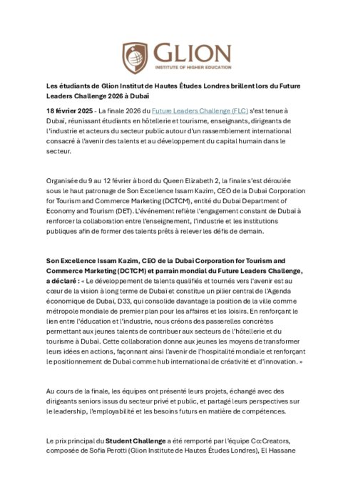 La finale 2026 du Future Leaders Challenge (FLC) s’est tenue à Dubaï, réunissant étudiants en hôtellerie et tourisme, enseignants, dirigeants de l’industrie et acteurs du secteur public autour d’un rassemblement international consacré à l’avenir des talents et au développement du capital humain dans le secteur.