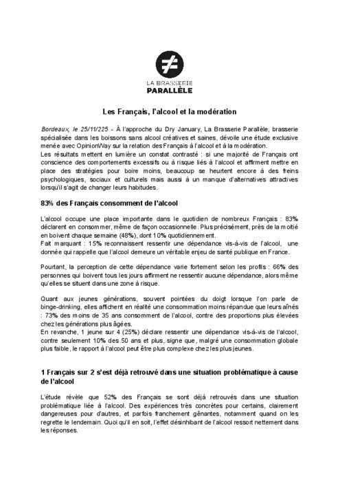 À l’approche du Dry January, La Brasserie Parallèle, brasserie spécialisée dans les boissons sans alcool créatives et saines, dévoile une étude exclusive menée avec OpinionWay sur la relation des Français à l’alcool et à la modération. Les résultats mettent en lumière un constat contrasté : si une majorité de Français ont conscience des comportements excessifs ou à risque liés à l’alcool et affirment mettre en place des stratégies pour boire moins, beaucoup se heurtent encore à des freins psychologiques, sociaux et culturels mais aussi à un manque d’alternatives attractives lorsqu’il s’agit de changer leurs habitudes.