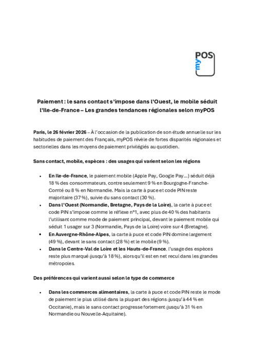 Fournisseurs 26 février 2026 - 10:02 À l’occasion de la publication de son étude annuelle sur les habitudes de paiement des Français, myPOS révèle de fortes disparités régionales et sectorielles dans les moyens de paiement privilégiés au quotidien. PDF (77 Ko) Télécharger Photo de energepic.com: https://www.pexels.com/fr-fr/photo/terminal-de-paiement-noir-2988232/