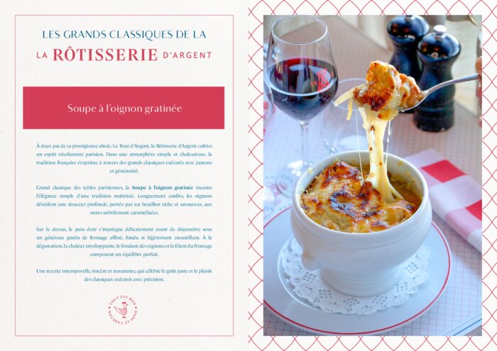 Parmi ses classiques, la soupe à l’oignon gratinée se distingue par des oignons longuement confits dans un bouillon savoureux, recouverts de pain doré et d’un gratin de fromage fondant. Un plat emblématique, simple et réconfortant, qui illustre le savoir-faire des grandes tables parisiennes.