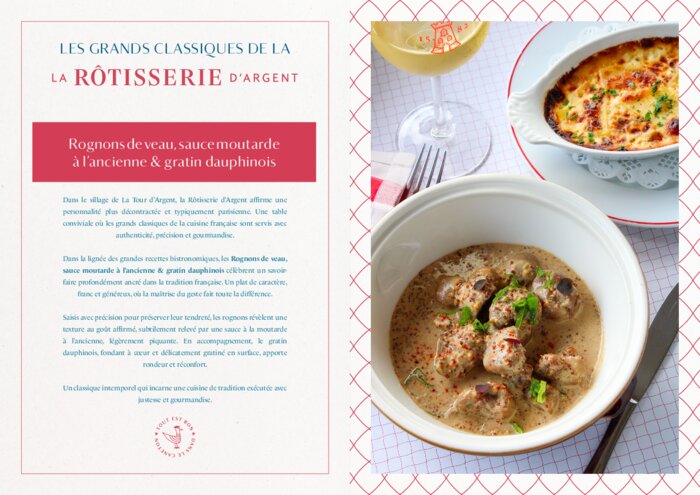 La Rôtisserie d’Argent propose une version plus décontractée et conviviale de la cuisine française, fidèle aux grands classiques. À l’image de ses rognons de veau sauce moutarde à l’ancienne accompagnés d’un gratin dauphinois, la maison met en avant un savoir-faire traditionnel, précis et généreux, pour une expérience authentique et gourmande.