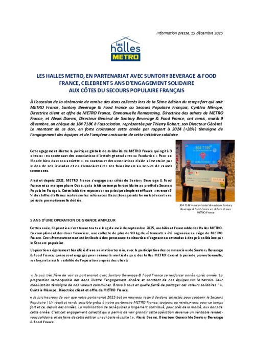 Cet engagement illustre la politique globale de solidarité de Metro France qui agit à 3 niveaux : en soutenant des associations d’intérêt général avec sa Fondation « Pour un Monde bien dans son assiette », en soutenant des associations d'aide alimentaire par le don de ses invendus et en s’associant avec ses fournisseurs au service de causes communes.