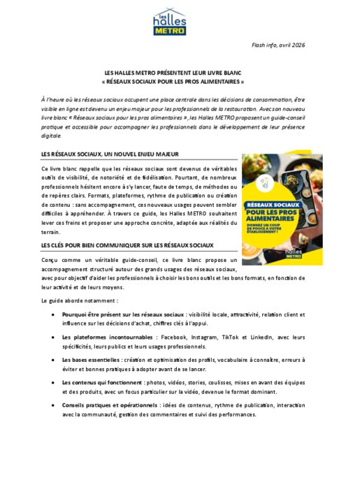 Ce livre blanc rappelle que les réseaux sociaux sont devenus de véritables outils de visibilité, de notoriété et de fidélisation. Pourtant, de nombreux professionnels hésitent encore à s’y lancer, faute de temps, de méthodes ou de repères clairs. Formats, plateformes, rythme de publication ou création de contenu : sans accompagnement, ces nouveaux usages peuvent sembler difficiles à appréhender. À travers ce guide, les Halles Metro souhaitent lever ces freins et proposer une approche concrète, adaptée aux réalités du terrain.