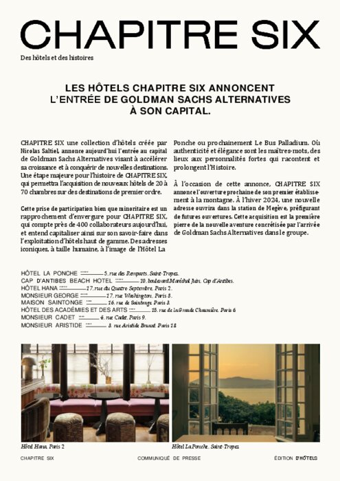 Chapitre Six une collection d’hôtels créée par Nicolas Saltiel, annonce aujourd’hui l’entrée au capital de Goldman Sachs Alternatives visant à accélérer sa croissance et à conquérir de nouvelles destinations. Une étape majeure pour l’histoire Chapitre Six, qui permettra l’acquisition de nouveaux hôtels de 20 à 70 chambres sur des destinations de premier ordre.