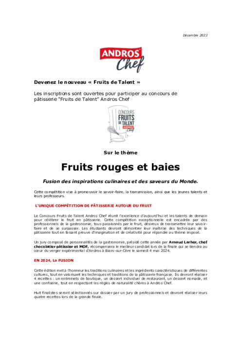 Les inscriptions sont ouvertes pour participer au concours de pâtisserie “Fruits de Talent” Andros Chef