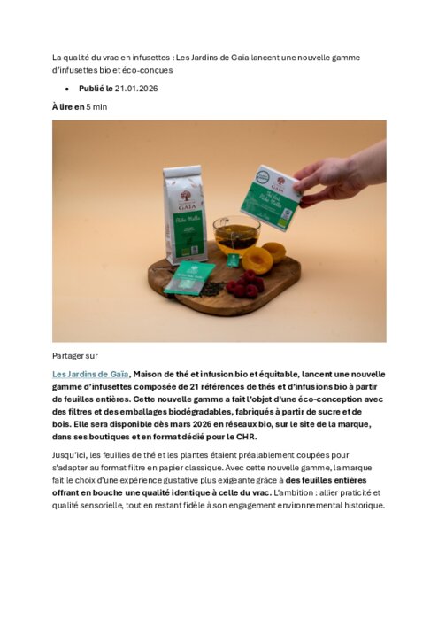Les Jardins de Gaïa, Maison de thé et infusion bio et équitable, lancent une nouvelle gamme d’infusettes composée de 21 références de thés et d’infusions bio à partir de feuilles entières. Cette nouvelle gamme a fait l’objet d’une éco-conception avec des filtres et des emballages biodégradables, fabriqués à partir de sucre et de bois. Elle sera disponible dès mars 2026 en réseaux bio, sur le site de la marque, dans ses boutiques et en format dédié pour le CHR.