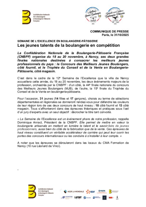 La Confédération Nationale de la Boulangerie-Pâtisserie Française (CNBPF) organise du 18 au 20 novembre, à Nancy, ses deux grandes finales nationales destinées à consacrer les meilleurs jeunes professionnels du pays : le Concours des Meilleurs Jeunes Boulangers, côté fournil, et le Trophée du Conseil et de la Vente en Boulangerie Pâtisserie, côté magasin.