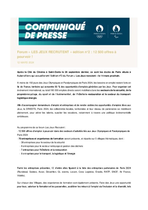 Après la Cité du Cinéma à Saint-Denis le 26 septembre , ce sont les docks de Paris situés à Aubervilliers qui accueilleront l’édition n°2 du Forum « Les Jeux recrutent » le 14 mars . A moins de 150 jours des Jeux Olympiques et Paralympiques de Paris 2024, les besoins en emploi restent forts en Ile de France, territoire qui concentre 80 % des opportunités d’emplois générées par les Jeux. Pour organiser cet événement international, au total 190 000 emplois directs seront mobilisés dans les secteurs de la sécurité, de la propreté-recyclage, du sport et de l’événementiel, de l’hôtellerie-restauration et le secteur du transport-logistique-énergie.
