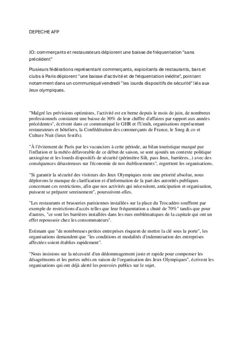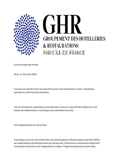 À quelques jours du lancement des Jeux Olympiques et Paralympiques de Paris 2024, les organisations professionnelles du secteur de l’hôtellerie et restauration déplorent une baisse d’activité et de fréquentation inédite. Malgré les prévisions optimistes, l'activité est en berne depuis le mois de juin, de nombreux professionnels constatent une baisse de 30% de leur chiffre d’affaires par rapport aux années précédentes.