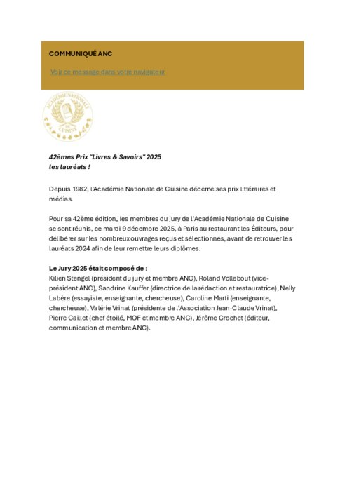 Pour sa 42e édition, les membres du jury de l’Académie Nationale de Cuisine se sont réunis, ce mardi 9 décembre, à Paris au restaurant les Éditeurs, pour délibérer sur les nombreux ouvrages reçus et sélectionnés, avant de retrouver les lauréats 2024 afin de leur remettre leurs diplômes.