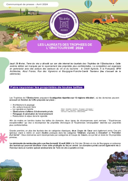Mardi 16 avril à la Cité des Climats et des vins de Bourgogne, Terre de vins, en partenariat avec une sélection d’acteurs de la filière viticole et œnotouristique, remettait les Trophées de l’Œnotourisme 2024. La remise des prix s'est déroulée en présence des lauréats des Trophées, ainsi que des partenaires de cette sixième édition. Les propriétés récompensées bénéficieront grâce à eux d’une visibilité accrue et d’une mise en avant de leurs activités.