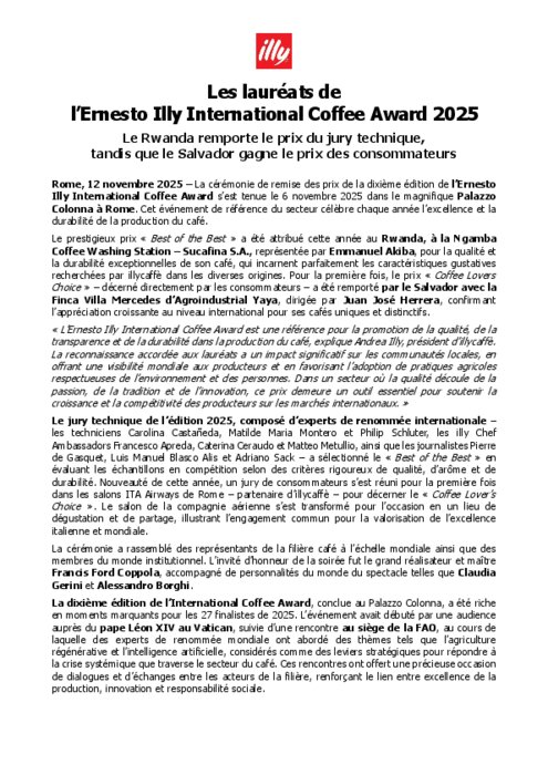 La cérémonie de remise des prix de la dixième édition de l’Ernesto Illy International Coffee Award s’est tenue le 6 novembre dans le magnifique Palazzo Colonna à Rome. Cet événement de référence du secteur célèbre chaque année l’excellence et la durabilité de la production du café.