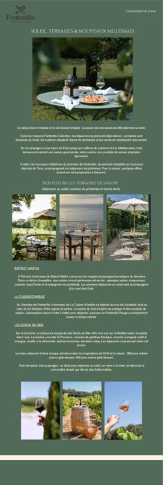 Restauration commerciale 18 mars 2026 - 12:32 Dans les maisons Fontenille Collection, les déjeuners se savourent déjà en extérieur. Les tables s’installent au soleil, les cuisines passent à l’heure printanière et les verres se remplissent en douceur. PDF (266 Ko) Télécharger