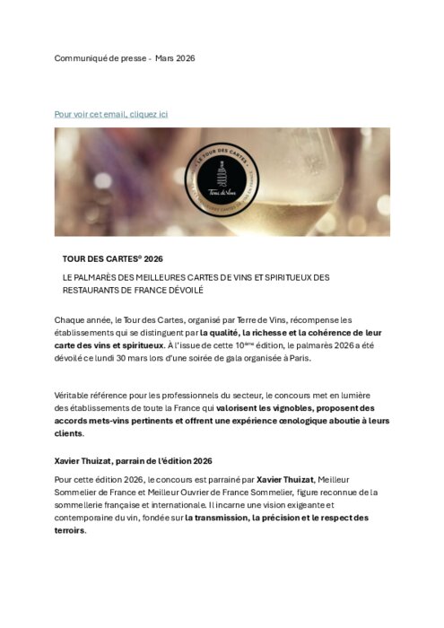 Chaque année, le Tour des Cartes, organisé par Terre de Vins, récompense les établissements qui se distinguent par la qualité, la richesse et la cohérence de leur carte des vins et spiritueux. À l’issue de cette 10ème édition, le palmarès 2026 a été dévoilé ce lundi 30 mars lors d’une soirée de gala organisée à Paris.