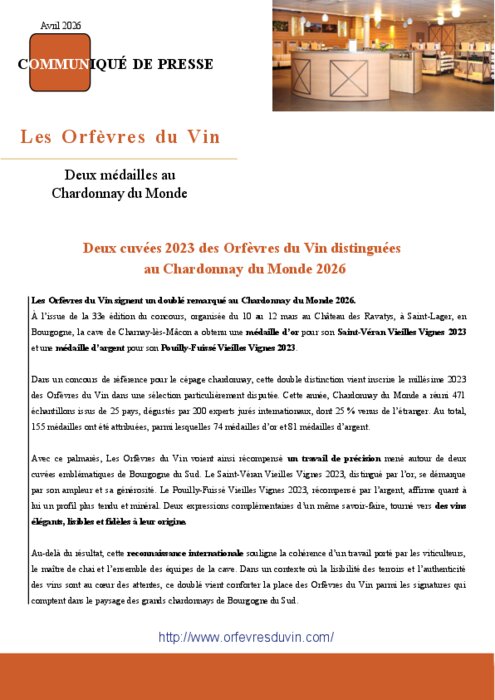 A l’issue de la 33e édition du concours, organisée du 10 au 12 mars au Château des Ravatys, à Saint-Lager, en Bourgogne, la cave de Charnay-lès-Mâcon a obtenu une médaille d’or pour son Saint-Véran Vieilles Vignes 2023 et une médaille d’argent pour son Pouilly-Fuissé Vieilles Vignes 2023.