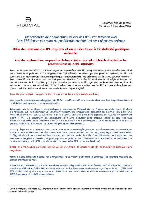 Les patrons de TPE anticipent les effets de l’instabilité politique (Baromètre des TPE - Fiducial)