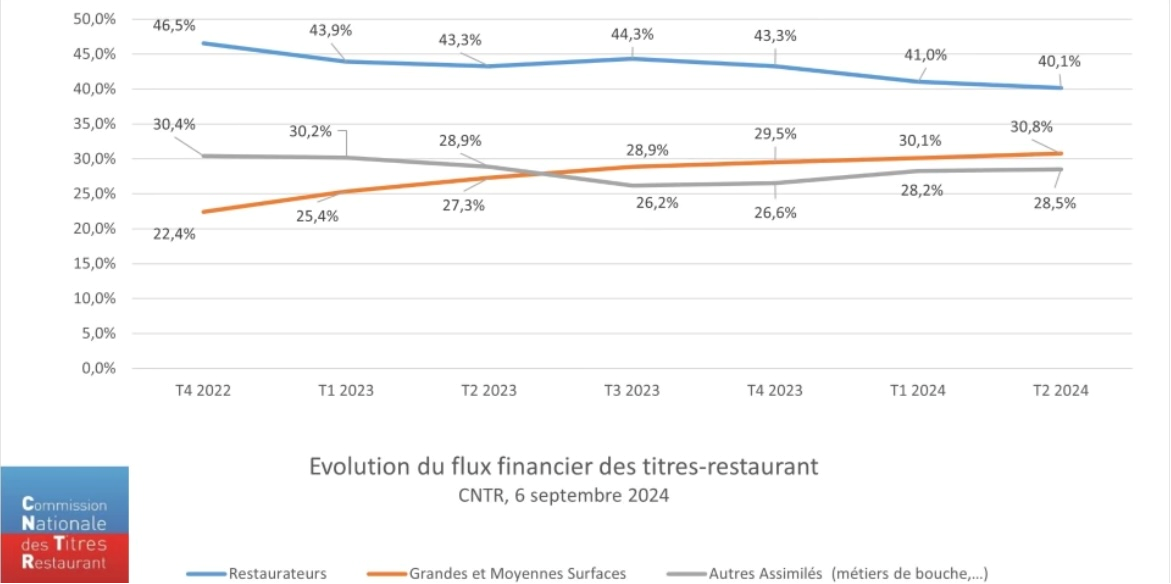 La CNTR (Commission Nationale des Titres Restaurants) vient d’actualiser la répartition des flux financier du titre-restaurant pour le 2e trimestre 2024 et les chiffres sont, une nouvelle fois, très défavorables aux restaurateurs. Depuis le 4e trimestre 2022 et l’entrée en vigueur de l’extension à tous produits alimentaires, la part de marché des grandes et moyennes surfaces a ainsi progressé de 8.4 points alors que celles des restaurateurs a reculé de 6.4 points sur la même période.