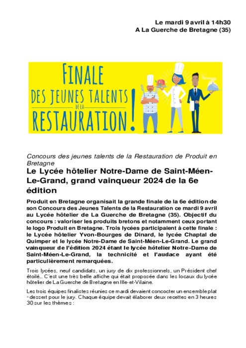 Pour sa 6e édition, le Concours des Jeunes Talents de la restauration, initié par la commission restauration hors domicile de Produit en Bretagne pour valoriser les métiers, les écoles et lycées hôteliers bretons mais aussi recruter de jeunes talents, s’offre une très belle finale le mardi 9 avril au Lycée Hôtelier Sainte-Thérèse de la Guerche de Bretagne (35). Cuisine, technicité, service en salle : les candidats seront scrutés sous toutes les coutures à nouveau cette année par un jury de professionnels, présidé par le chef étoilé Baptiste Denieul de Guer.
