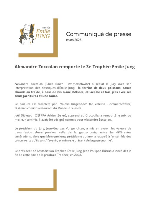 Alexandre Zoccolan (Julien Binz - Ammerschwihr) a séduit le jury avec son interprétation des classiques d’Emile Jung, la terrine de deux poissons, sauce chaude ou froide, à base de vin blanc d’Alsace, et lacaille et foie gras avec ses deux garnitures et une sauce.