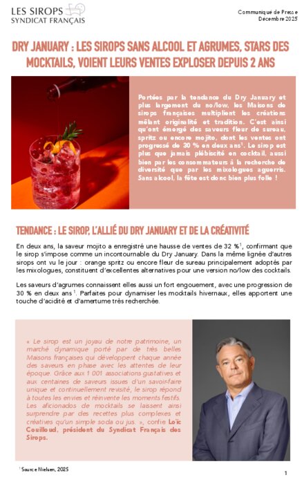 mêlant originalité et tradition. C’est ainsi qu’ont émergé des saveurs fleur de sureau, spritz ou encore mojito, dont les ventes ont progressé de 30 % en deux ans. Le sirop est plus que jamais plébiscité en cocktail, aussi bien par les consommateurs à la recherche de diversité que par les mixologues aguerris.