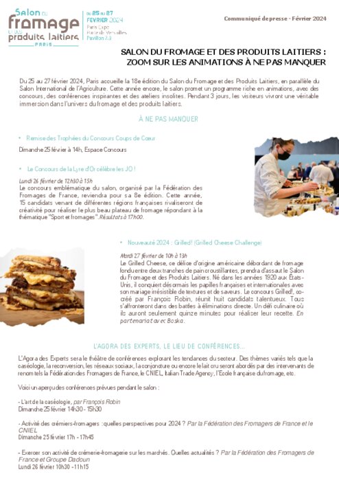 La 18e édition du Salon du Fromage et des Produits Laitiers aura lieu ce week-end, du dimanche 25 au mardi 27 février, au pavillon 7.3 de Paris Expo Porte de Versailles. Il s'agit d'un salon professionnel qui a lieu tous les deux ans, en parallèle du SIA. 290 exposants seront présents, l'occasion pour vous de rencontrer des petits producteurs, affineurs, crémiers-fromagers.