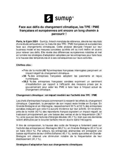 56 % des entreprises françaises adoptent les paiements et reçus numériques. 59,3 % des entreprises françaises sondées expriment un sentiment d’insatisfaction par rapport à l'efficacité des mesures prises par le gouvernement pour aider les PME à faire face à l'impact actuel du changement climatique.