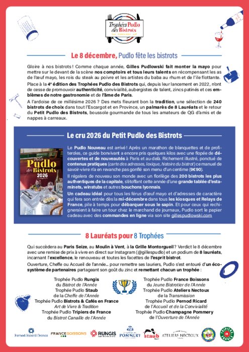 édition des Trophées Pudlo des Bistrots qui, depuis leur lancement en 2022, n’ont de cesse de promouvoir authenticité, convivialité, aubergistes de talent, zincs patinés et ces emblèmes de la gastronomie et de l’âme de Paris.