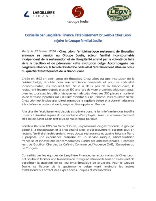 Chez Léon, l’emblématique restaurant de Bruxelles, annonce sa cession au Groupe Joulie, acteur familial incontournable indépendant de la restauration et de l’hospitalité animé par la volonté de faire vivre la tradition et de pérenniser cette institution belge. Accompagnée par Largillière Finance, la famille fondatrice cède ainsi l’établissement situé au cœur du quartier très fréquenté de la Grand-Place.