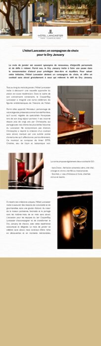 Le mois de janvier est souvent synonyme de renouveau, d’objectifs personnels et de défis à relever. Parmi eux, le Dry January invite à faire une pause dans la consommation d’alcool pour privilégier bien-être et équilibre. Pour saluer cette initiative, l’Hôtel Lancaster devient un compagnon de choix, et offre un cocktail sans alcool gratuitement à ceux qui relèvent le défi du Dry January.