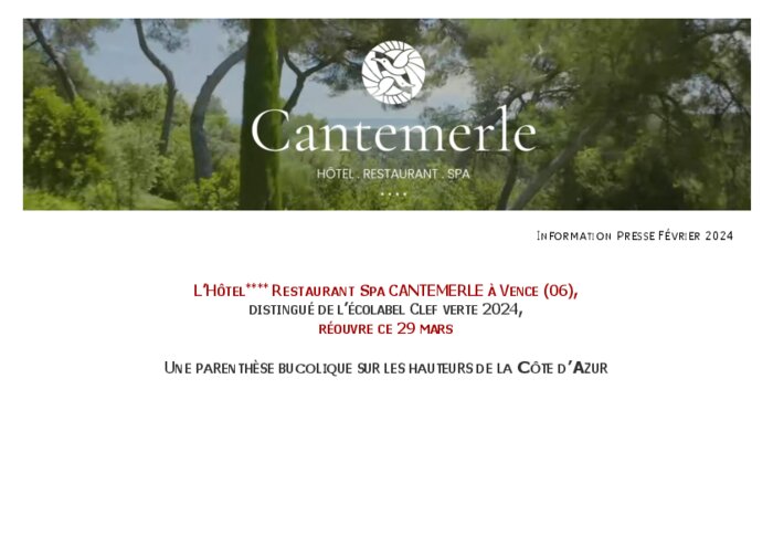 Adeptes du tourisme responsable, amoureux des grands espaces verdoyants entre terre et mer, de vacances dans des lieux intimistes à l’ambiance chic et décontractée, l'Hôtel Restaurant Spa Cantemerle est l’établissement incontournable de la Côte d’Azur. Sur un domaine de deux hectares où règnent des pins centenaires, cet écrin privilégié offre une multitude de prestations haut de gamme pour se ressourcer le temps d’un séjour, d’une demi-journée cocooning ou d’un dîner .