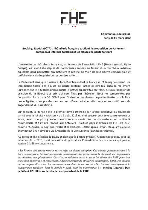 L’ensemble de l’hôtellerie française, au travers de l’association FHE (French Hospitality in Europe), est mobilisée depuis de nombreuses années en faveur d’un marché numérique équitable pour permettre aux hôteliers la reprise en main de leur liberté commerciale et tarifaire vis-à-vis des plateformes de réservation.