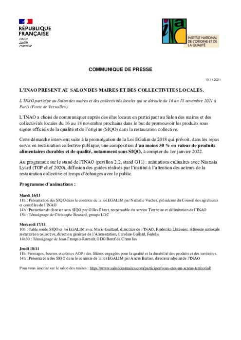 L'INAO a choisi de communiquer auprès des élus locaux en participant au Salon des maires et des collectivités locales du 16 au 18 novembre dans le but de promouvoir les produits sous signes officiels de la qualité et de l'origine (SIQO) dans la restauration collective.
