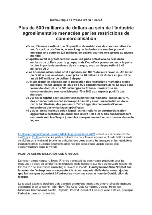 Suite à l'introduction de restrictions de commercialisation pour les produits du tabac et à des appels répétés pour étendre la législation à davantage de secteurs, Brand Finance a de nouveau analysé l'impact potentiel de telles politiques sur les marques d'aliments et de boissons.
