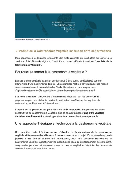 L’Institut de la Gastronomie Végétale lance son offre de formations