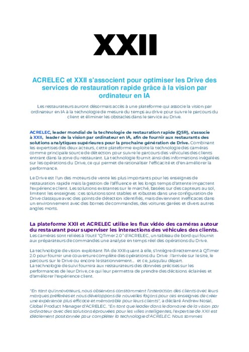 Fournisseurs 09 janvier 2023 - 12:34 Les restaurateurs auront désormais accès à une plateforme qui associe la vision par ordinateur en IA à la technologie de mesure du temps au drive pour suivre le parcours du client et éliminer les obstacles dans le service au Drive. PDF (91 Ko) Télécharger