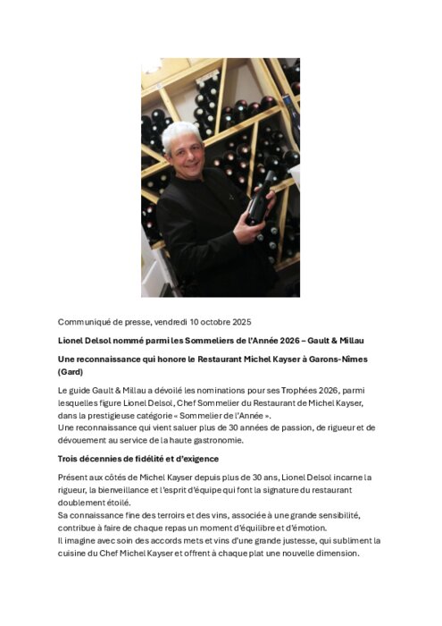 Le guide Gault et Millau a dévoilé les nominations pour ses Trophées 2026, parmi lesquelles figure Lionel Delsol, Chef Sommelier du Restaurant de Michel Kayser, dans la prestigieuse catégorie « Sommelier de l’Année ». Une reconnaissance qui vient saluer plus de 30 années de passion, de rigueur et de dévouement au service de la haute gastronomie.