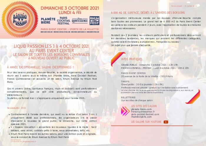 Métiers 15 juillet 2021 - 15:52 Pour des raisons pratiques, Amuse-Bouche, la société organisatrice, a décidé de réunir ses 3 salons sous le même toit (Planète Bière, Paris Cocktail Festival, France Quintessence) et accueille un 4e salon, Rhum Avenue by Rhum Fest Paris. PDF (412 Ko) Télécharger